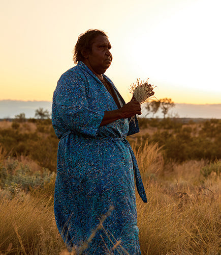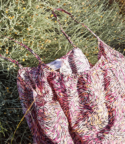 Joining Papinelle in partnership with David Jones, for one of our most soulful creative collaborations yet, the late Indigenous artist J. Pitjara Long has lent her exuberant expression of the natural world, rooted deeply in her culture, to this vibrant, painterly print. Regretfully, she passed away late December 2022 and so it is with the upmost respect for her artistry and in honour of her legacy that we introduce Papinelle X J. Pitjara Long.