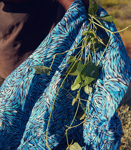 In palettes of restful blues and spirited pinks, J. Pitjara Long's representation of Atnwelarr or Bush Yam unfurls in a meeting of traditional and contemporary design. Her bushstrokes have been guided by the stories passed down for many generations through J. Pitjara Long's family as custodians of the Bush Yam.