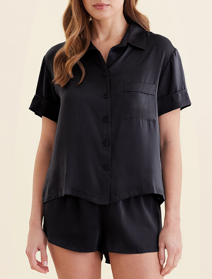 - Notch collar with front button closure, short sleeves